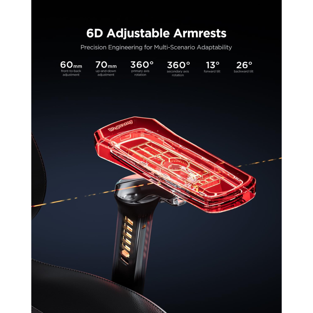 6D Adjustable Armrests – Offers motion in six directions: 1.2" forward/back, 0.8" lateral, 3.1" height, 70° rotation, 40° armrest surface fold, with synchronized alignment