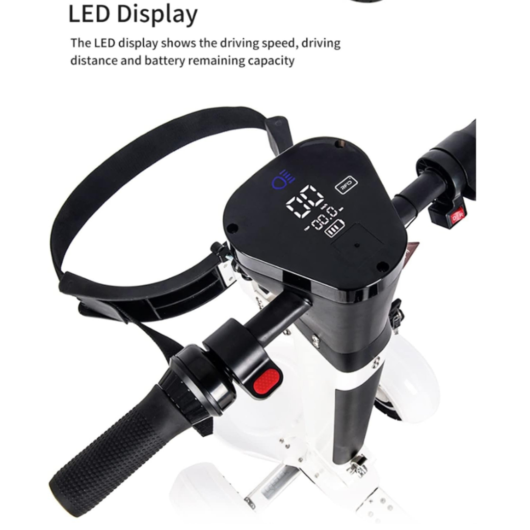 Ergonomic Controls: Simple forward and reverse button controls with thumb throttle. Digital LED screen displays battery, speed, and gear selection (D for forward, R for reverse).