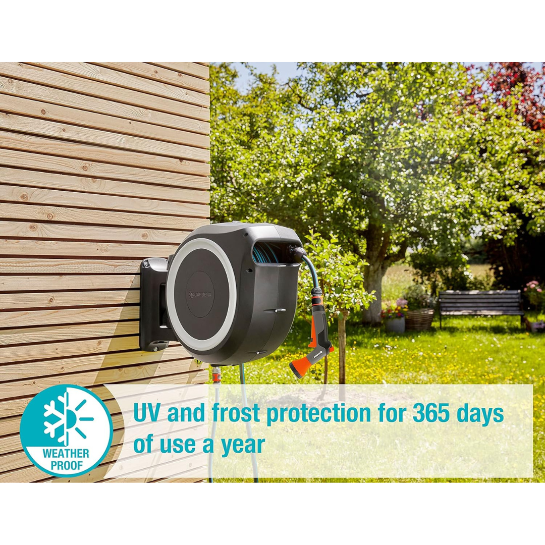 The 180° pivoting wall bracket allows you to move freely and water hard-to-reach areas with ease. Whether you’re tending to flowerbeds or washing down patio furniture, the hose follows you fluidly. -