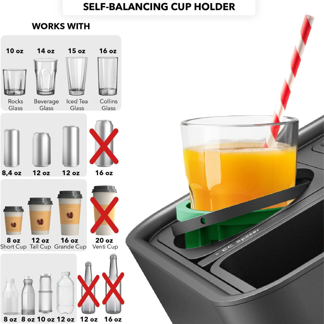 Self-Balancing Cupholder: Equipped with a high-performance gyroscope system that keeps your drink upright—even on uneven or soft surfaces like couches, beds, or cushions. Lock the mechanism in place for extra spill protection.