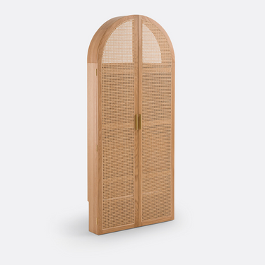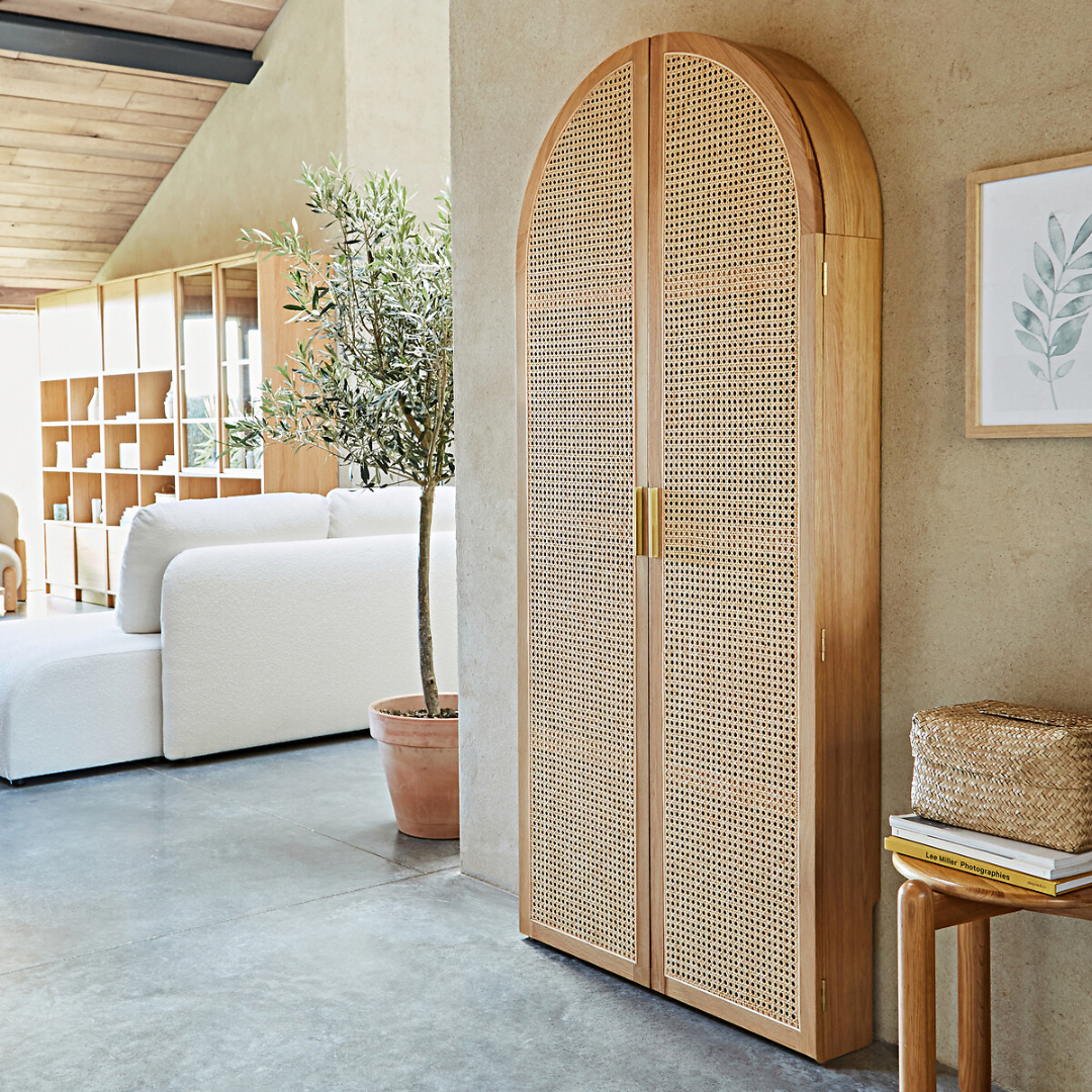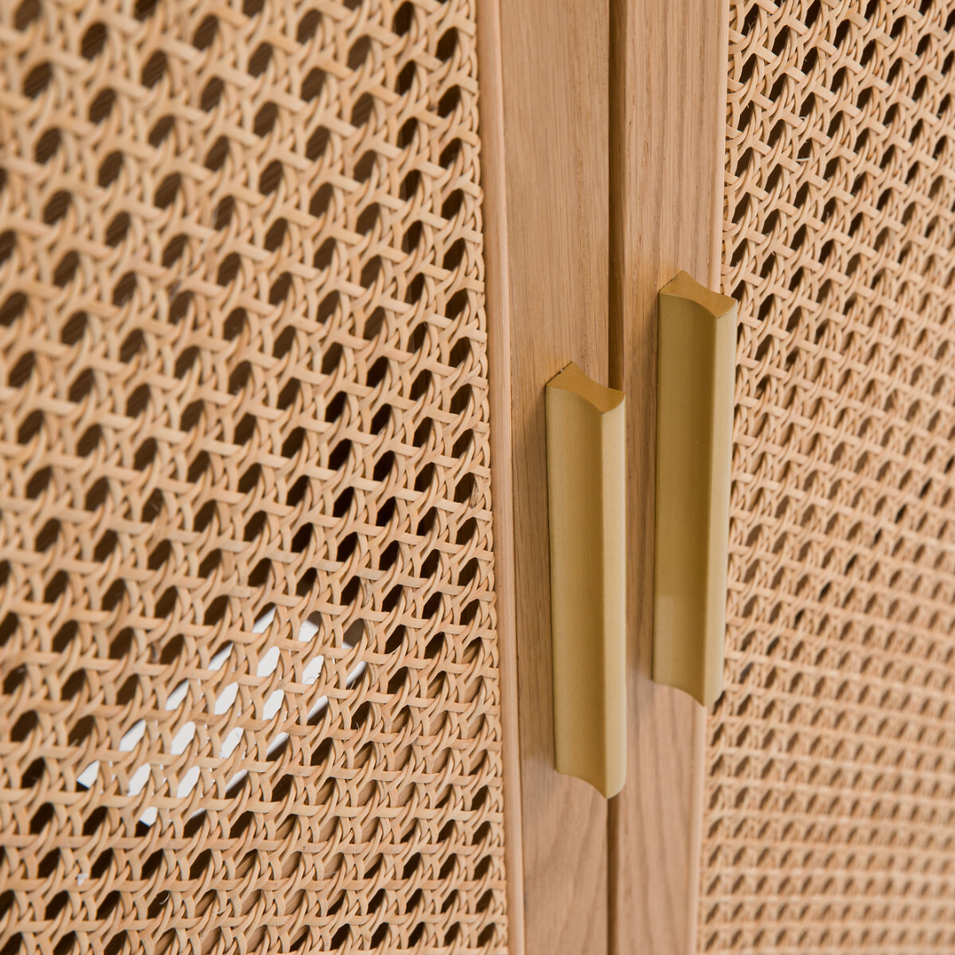 Doors feature warm oak paired with rattan cane for texture and style