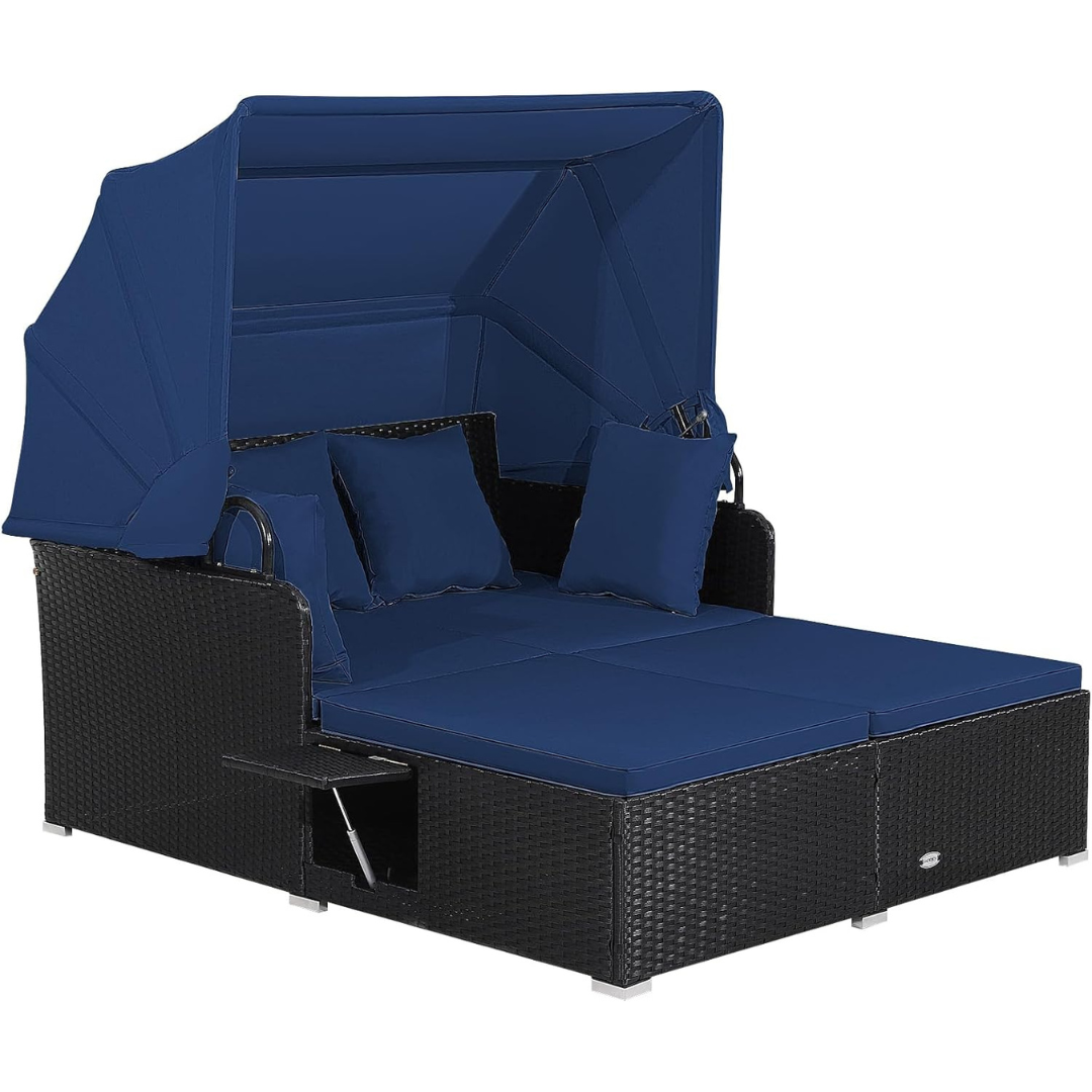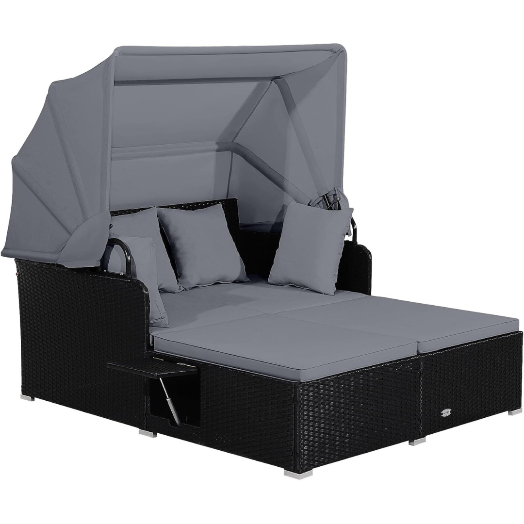 Wicker Sun Lounger with Retractable Canopy and Folding Trays
